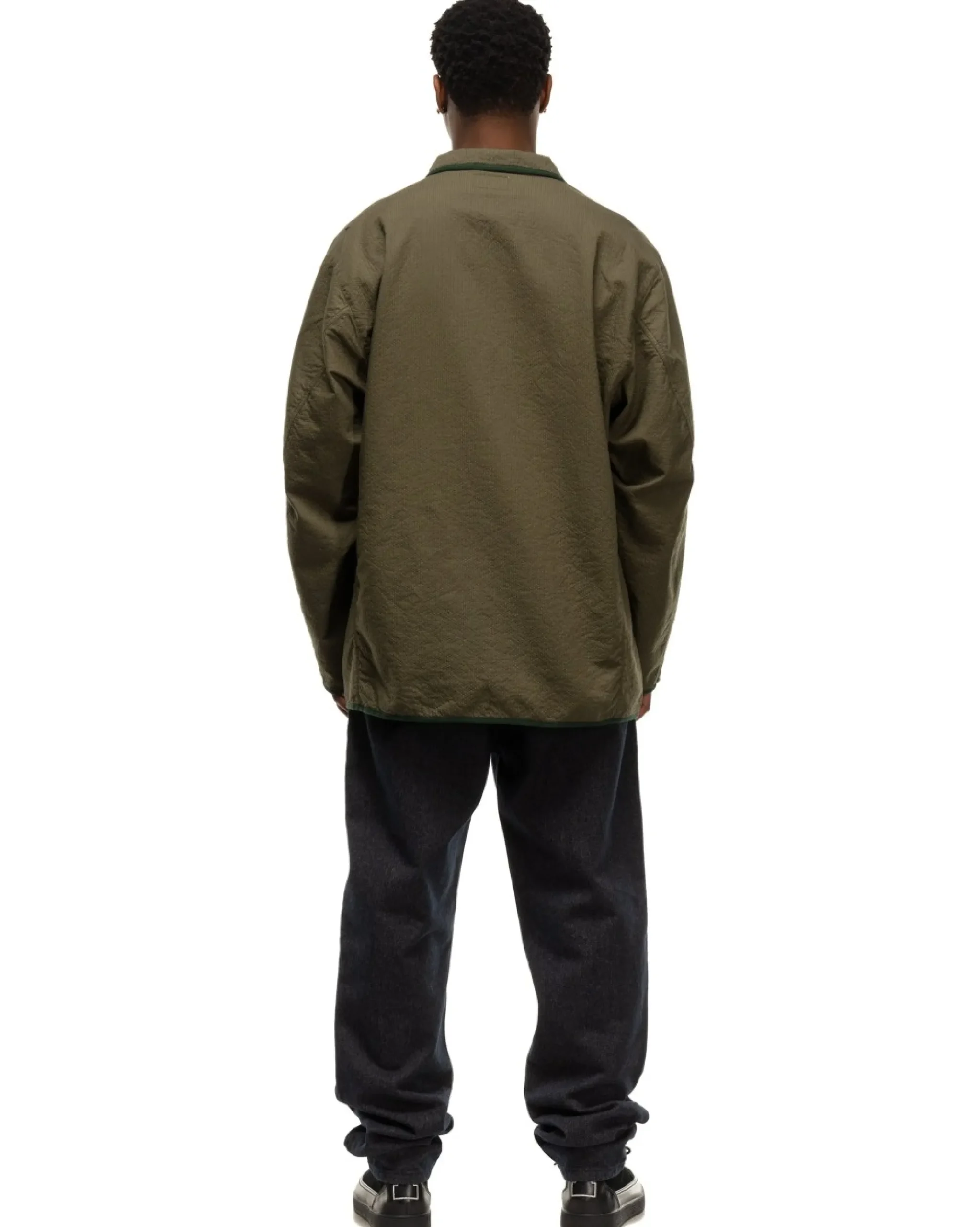 Jacket Constructed From 100% Textured Cotton. This Jacket Is A Mashup Of Sport Coat And Military Liner Jacket, Pulling Interesting References From Each. The Peaked Lapel And Pocket Layout Are Typical Of Casual Sport Coats While The Textured Fabric And Contrast Binding At Seems Evoke Collarless Liner Jackets Found In The Military. Made In Japan.
