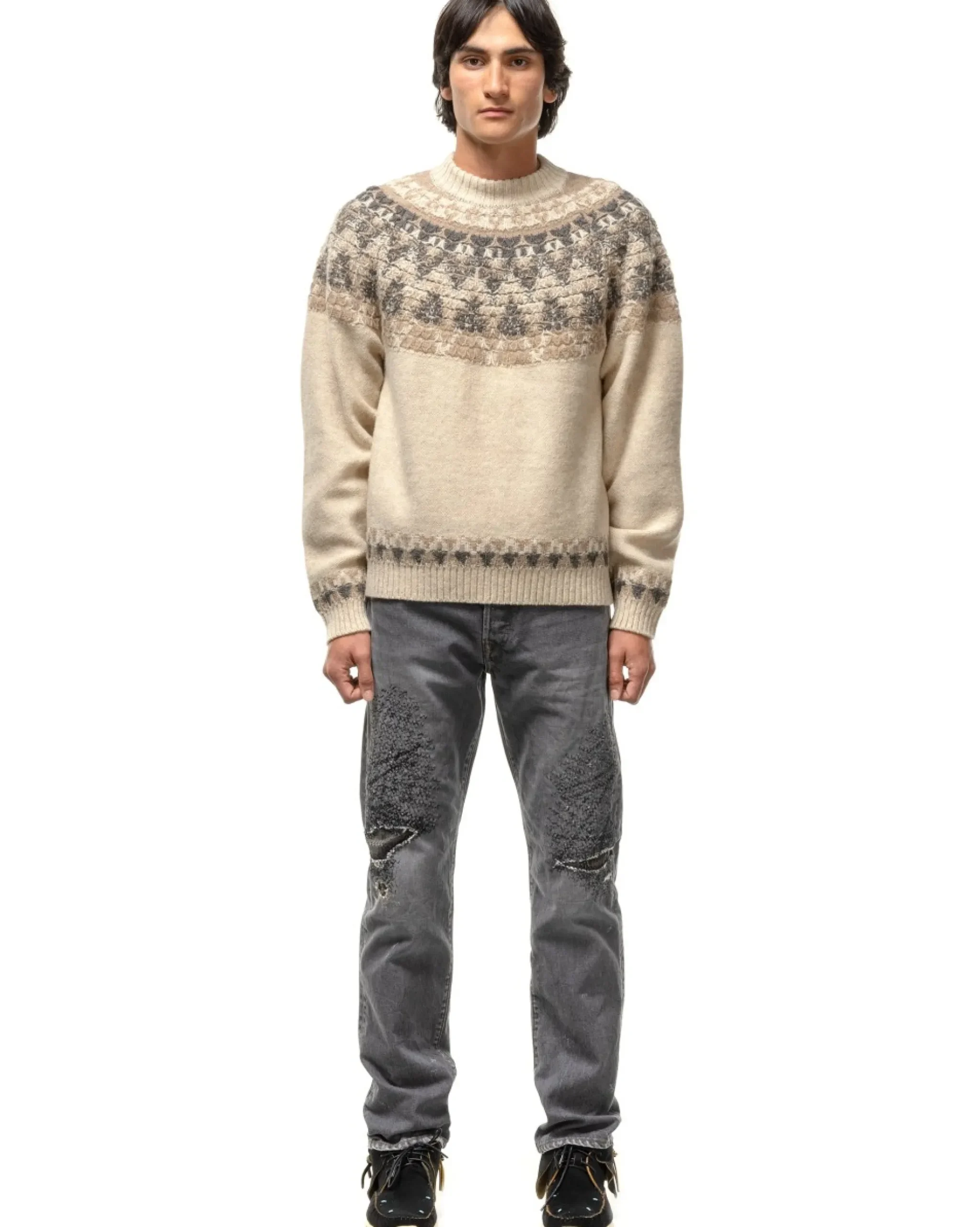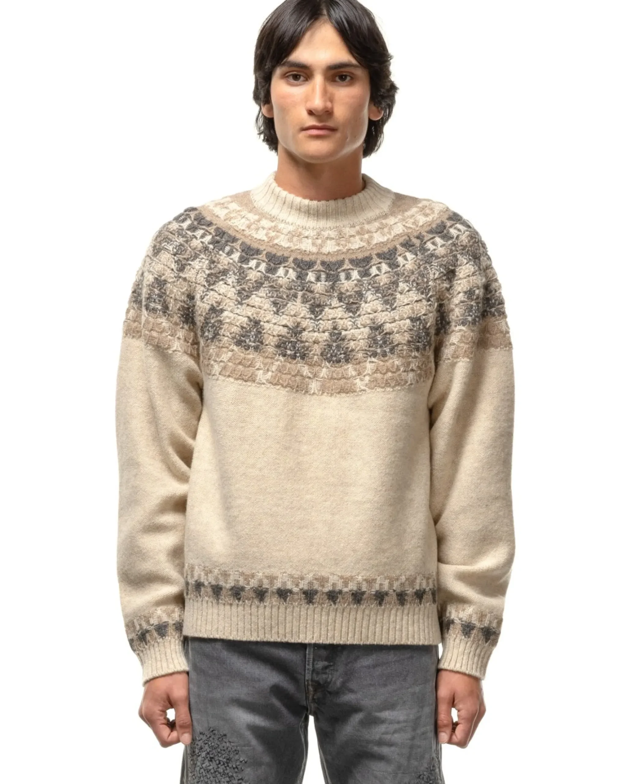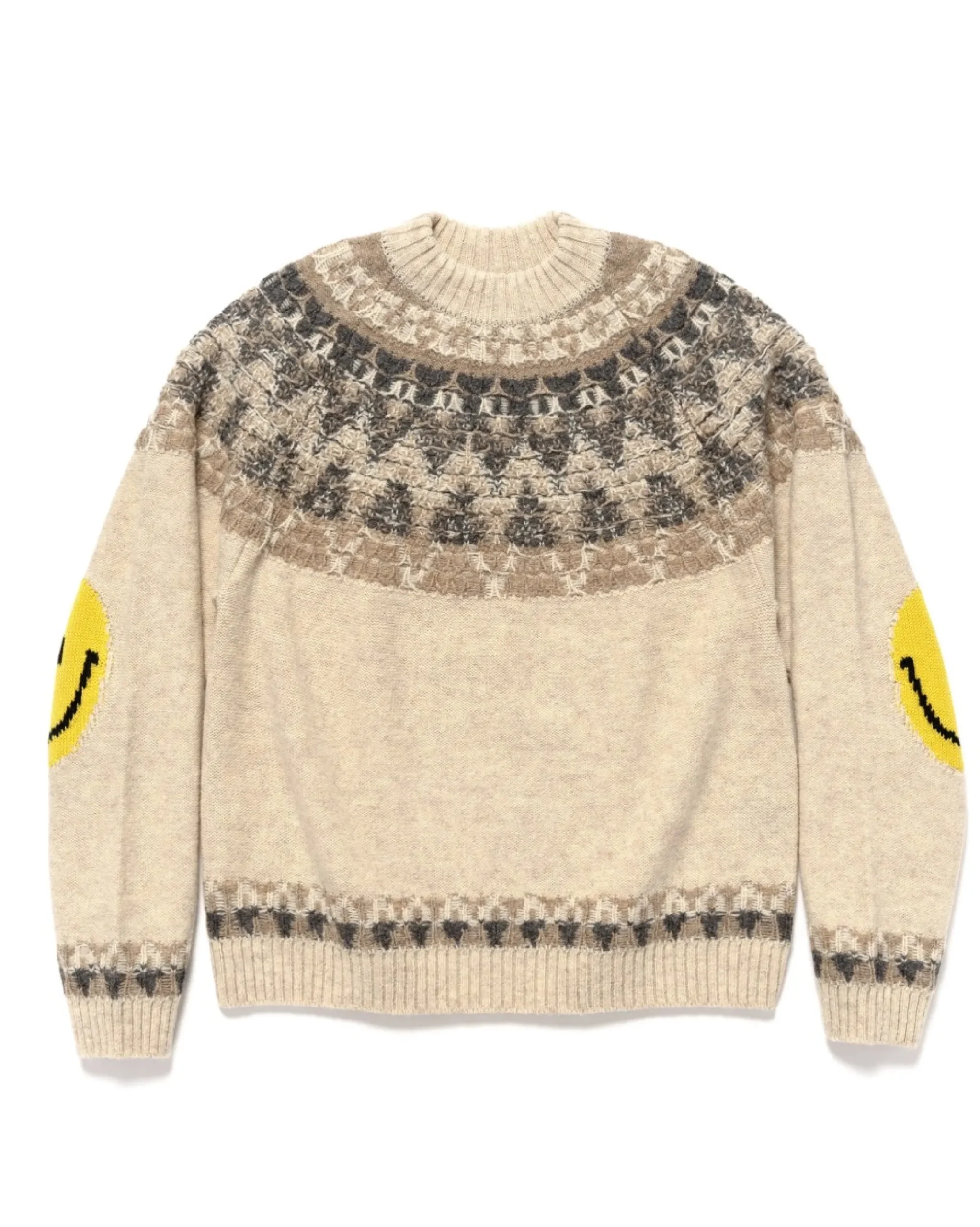 With A Loose, Five Gauge Knit, This Wool Knit Sweater Features A Custom Nordic Knit Pattern And Ribbing At The Cuffs, Hem And Collar. Kapital’S Signature Smiley Icons Are Woven At The Elbows And The Sweater Is Finished With Raglan Sleeves. Made In Japan.