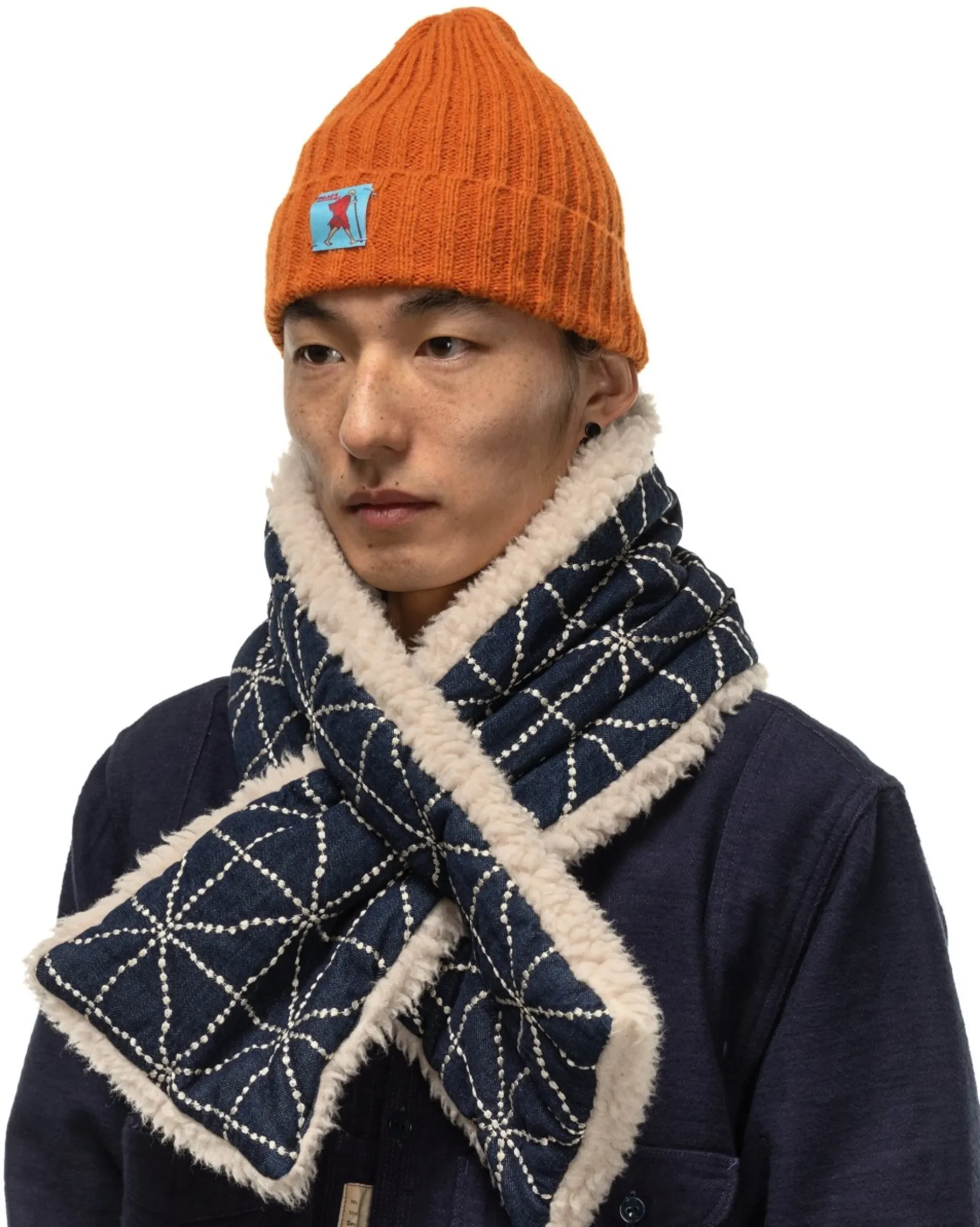 Insulated Scarf In 100% Cotton, 8Oz Denim With Custom Sashiko Embroidery Pattern Throughout. Padded Polyester Batting Provides Warmth And A Hole In One Side Allows It To Be Fastened. Made In Japan.