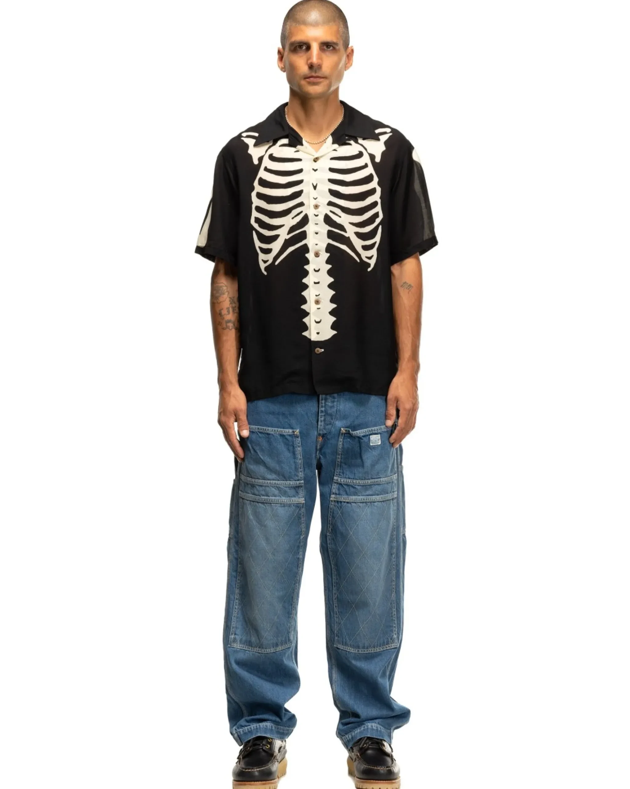 Vintage Inspired Shirt In A Silk Cupra Fabric Featuring Kapital’S Iconic Skeleton Detailing. Features A Boxy Fit With Spread Collar, When Paired With The Luxurious Fabric Make This An Otimum Shirt For The Warmer Months. Made In Japan.