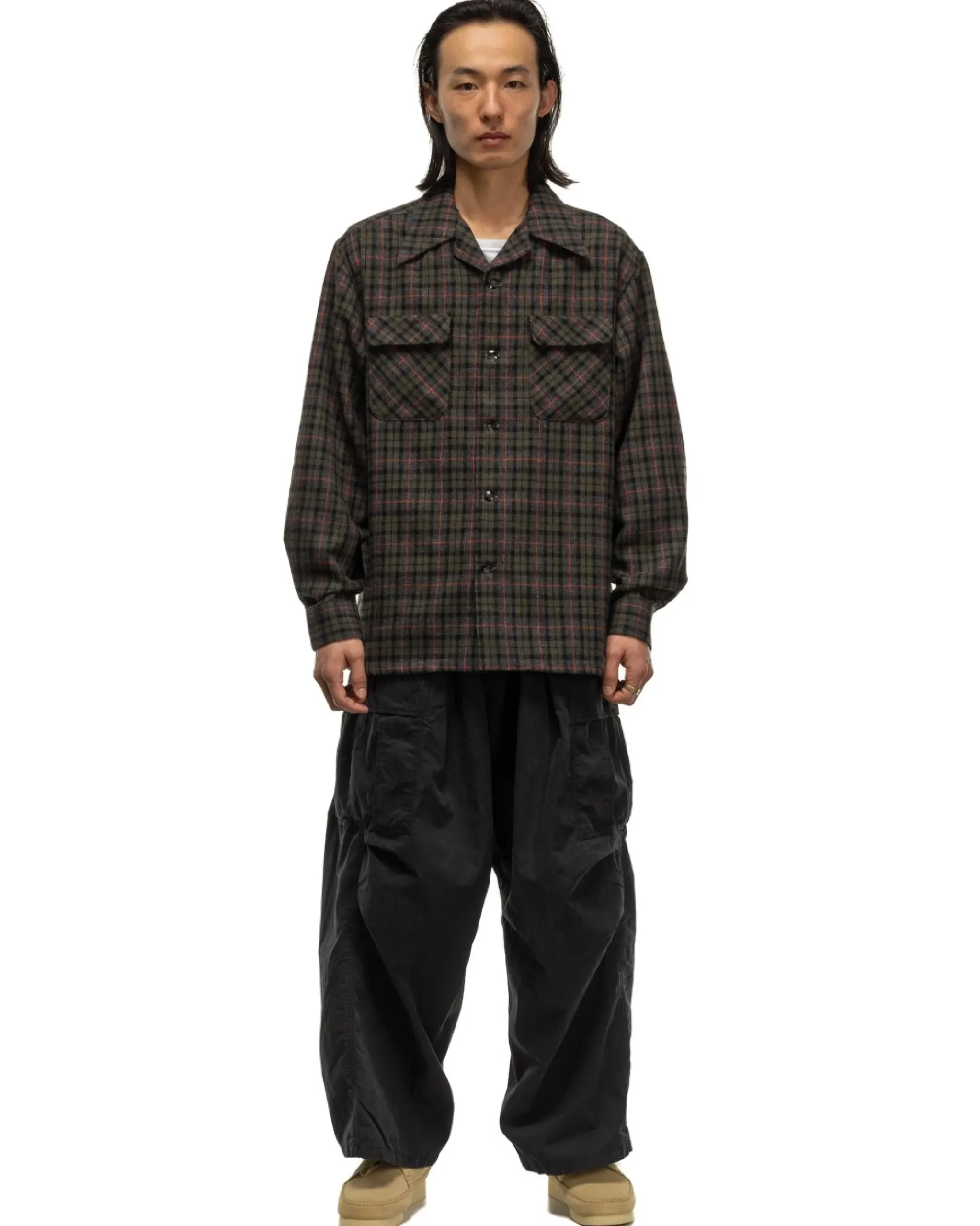 A Boxy Fitting Top Constructed From A Checered Wool Mix Fabric And A Full Button Placket At The Front. Featuring Flap Chest Pockets, Button Cuffs, And A Straight Cut Hemline. Finished With An Inner Polyester Lines Yoke. Made In Japan.