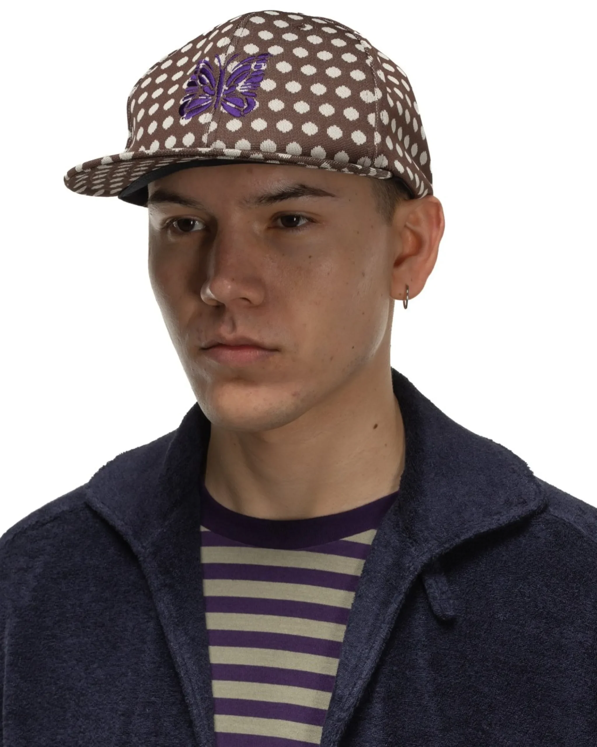 A Baseball Cap With 6-Panel Construction Made From A Textural Polyester Fabric With A Jacquard Woven Polka Dot Pattern And Embroidered ‘Papillon’ Butterfly Logo. Finished With A Structural Flat Brim, Embroidered Eyelets And A Mesh Lining. Made In Japan.