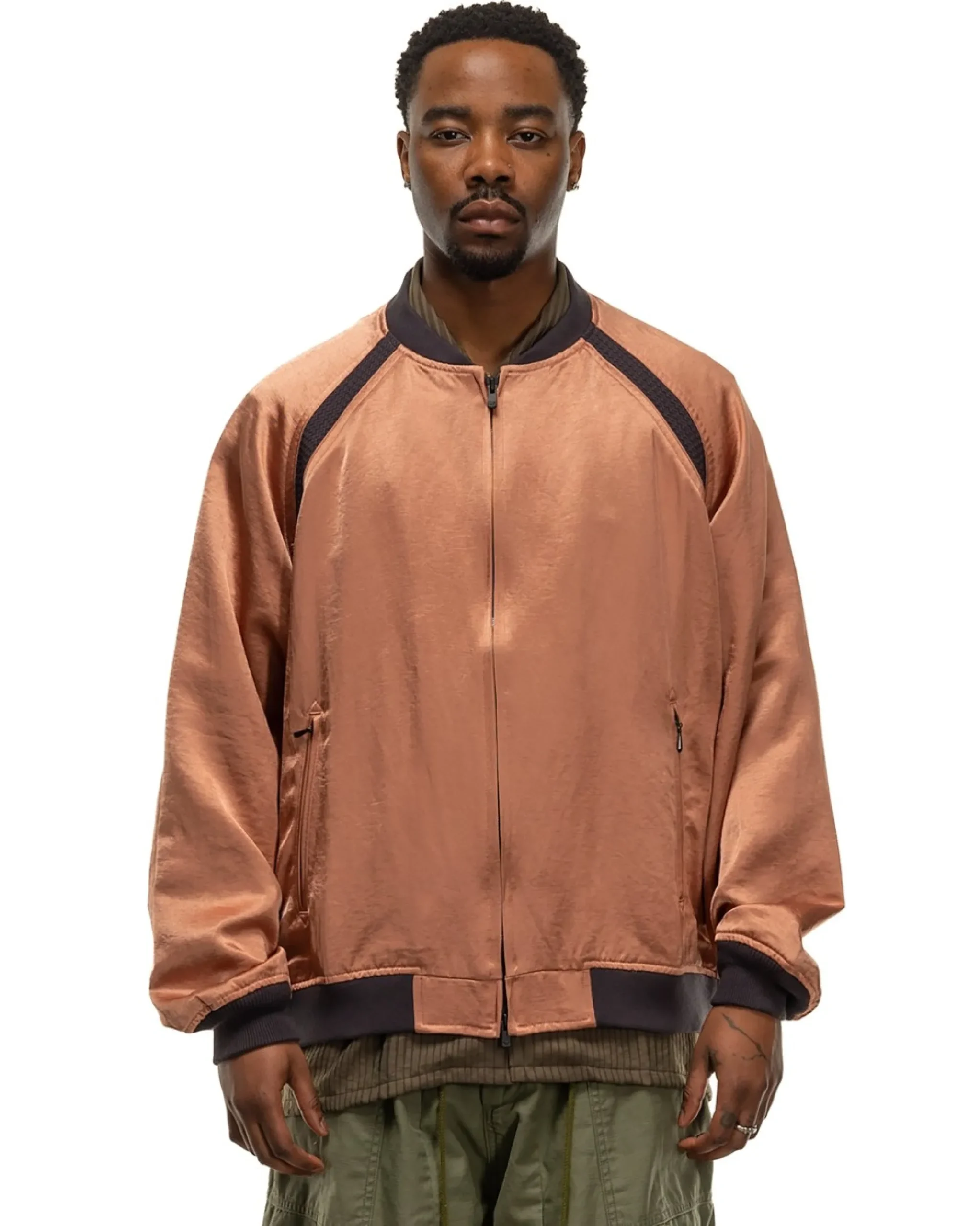A Seasonal Reimagination Of The Classic Souvenir Jacket Silhouette In A Voluminous, Yet Tailored Proportion Constructed From A Rosy Satin Fabric. Features A Distinct Ribbed Detail Following The Arm Seams, Ribbed Finishes Through All Openings, Lining For Additional Comfort, And Two Zipper Hand Pockets For Secure Storage.