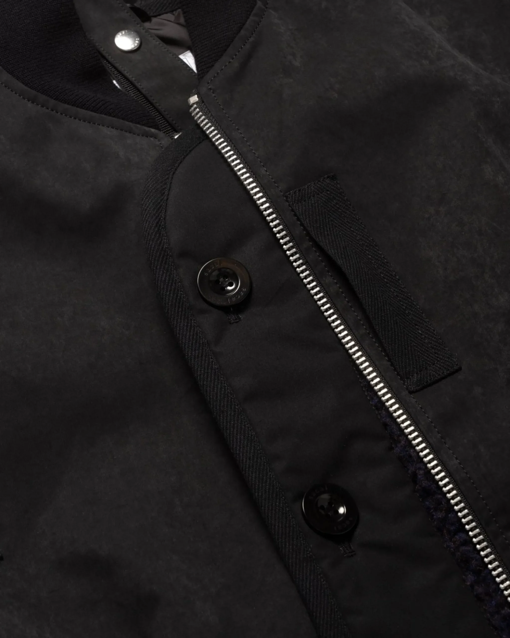 Ma-1 Inspired Jacket Built In A Densely Woven Weather Resistant Fabric Carrying A Fine, Brushed Hand, Giving It A Noticeably Plush Surface Reminiscent Of Suede Or Nubuck. Accentuated With Military Liner Style Panels, The Bomber Style Piece Is Cut Relatively Clean, With A Contrasting Dual Metal Front Zip, And Two Front Buttons That Interact With The Liner Within. Further Classic Reference Details Can Be Found On The Chest And Sleeve Areas. The Panels Undernath Utilize A Fleece Fabric That Adds An Extra Layer Of Warmth, Making It Ideal For Brisk Weather Outdoors. Finished With Side Vents And An Inner Sling Allowing For Functional And Adjustable Styling.