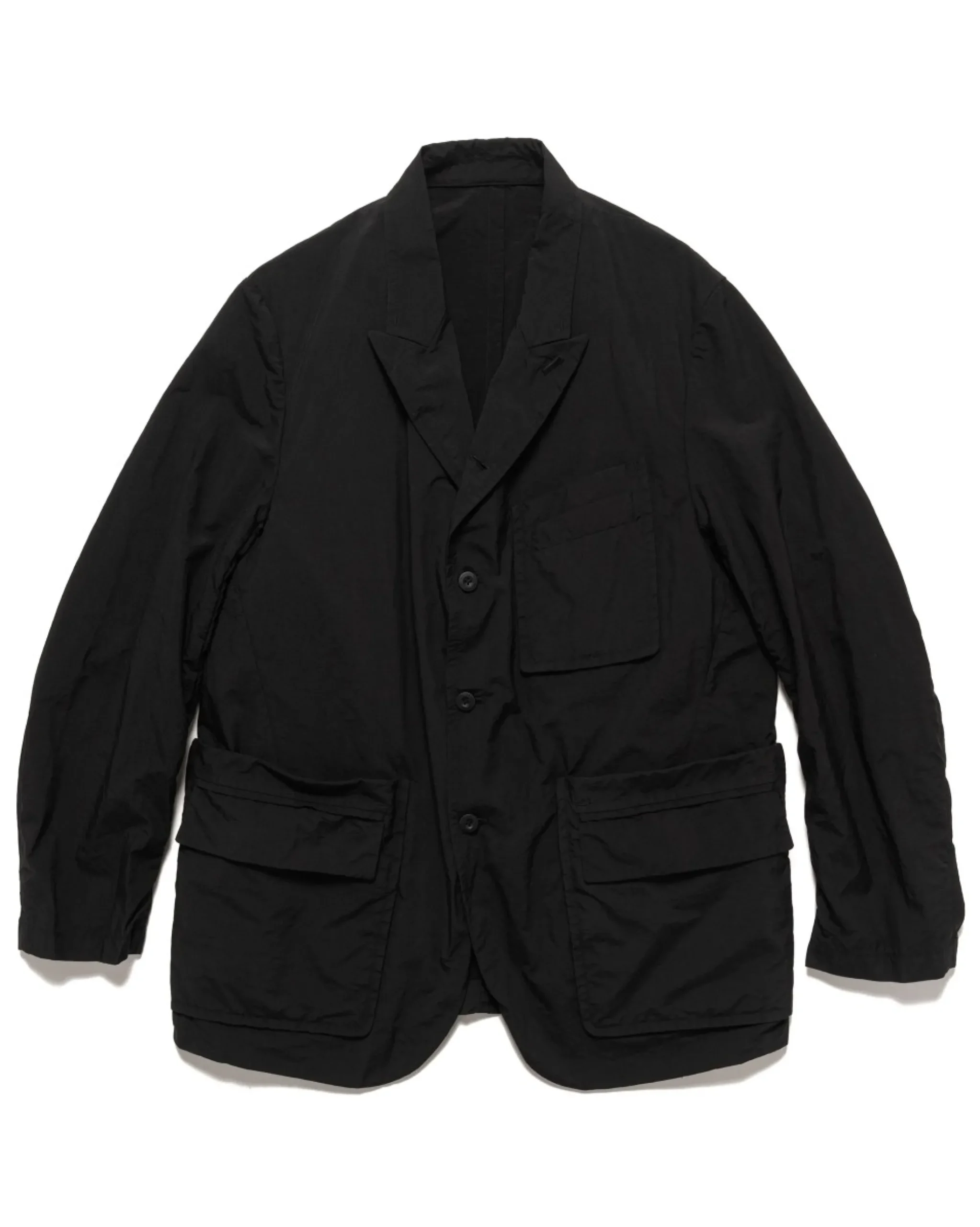 Blazer Style Jacket In A Lightweight Anti Wrinkle, Anti Fouling, Tearproof Brushed Nylon Yarn With A Crisp Dry Feel Like Cotton, The Firmness And Stiffness Of Silk, And The Strength Of Nylon. Features Multiple Large-Capacity Pockets & Smaller Functional Pockets, Hanger Hook Behind Collar And Integrated Internal Packable Pouch. Made In Japan.