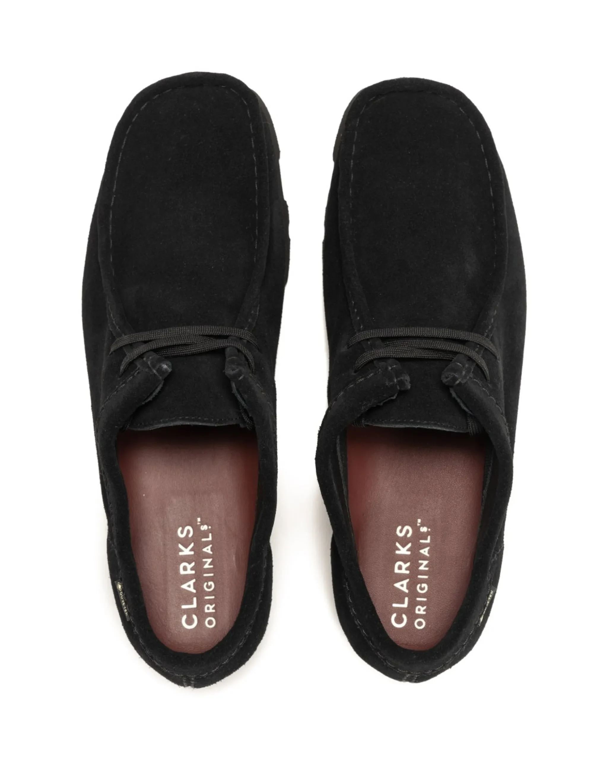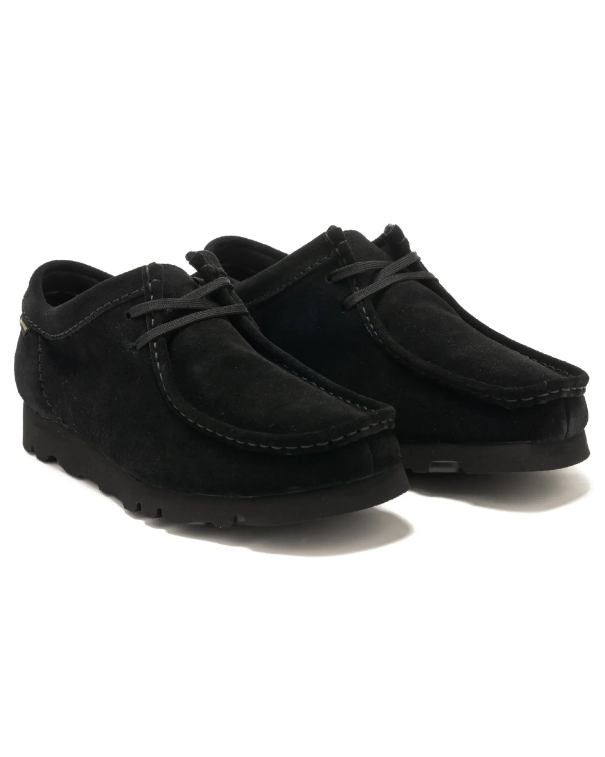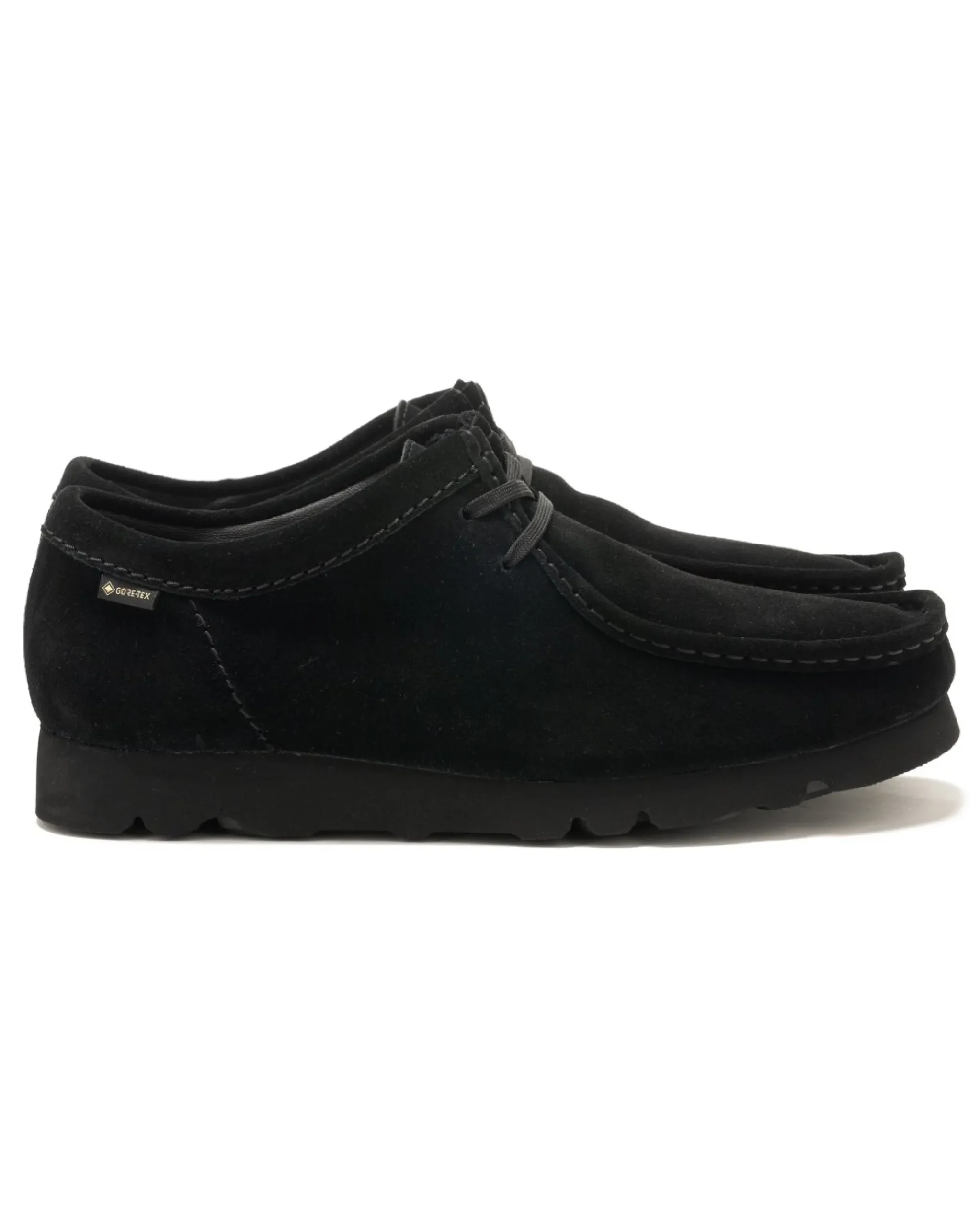 A Clarks Original Sillhouette, The Iconic Wallabee Shoe Is Crafted From A Soft Suede That Features A Full Gore-Tex® Lining For Waterproof And Breathable Protection. Featured In An All Black Construction, Including The Crepe Soles, Leather Lined, And A Flag Label At The Collar.