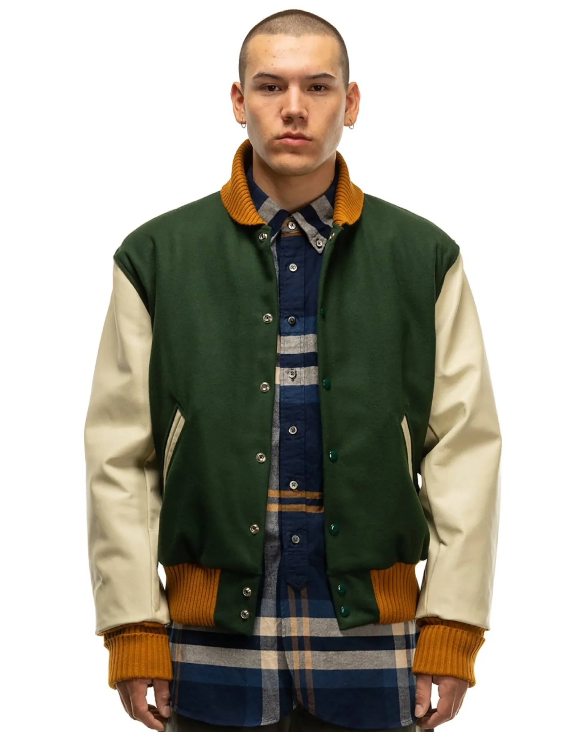 Made In Collaboration With The Heritage Brand Albion In Their Los Angeles Factory. This Classic Varsity Style Jacket Stays True To The Pieces Albion Have Been Making Through Their 100 Year History. The Combination Of The Dense Melton Wool Body, Quilted Lining And Ribbing Will Keep You Warm On The Coldest Days. Finished With Leather Sleeves, That Will Age Beautifully Over Time.