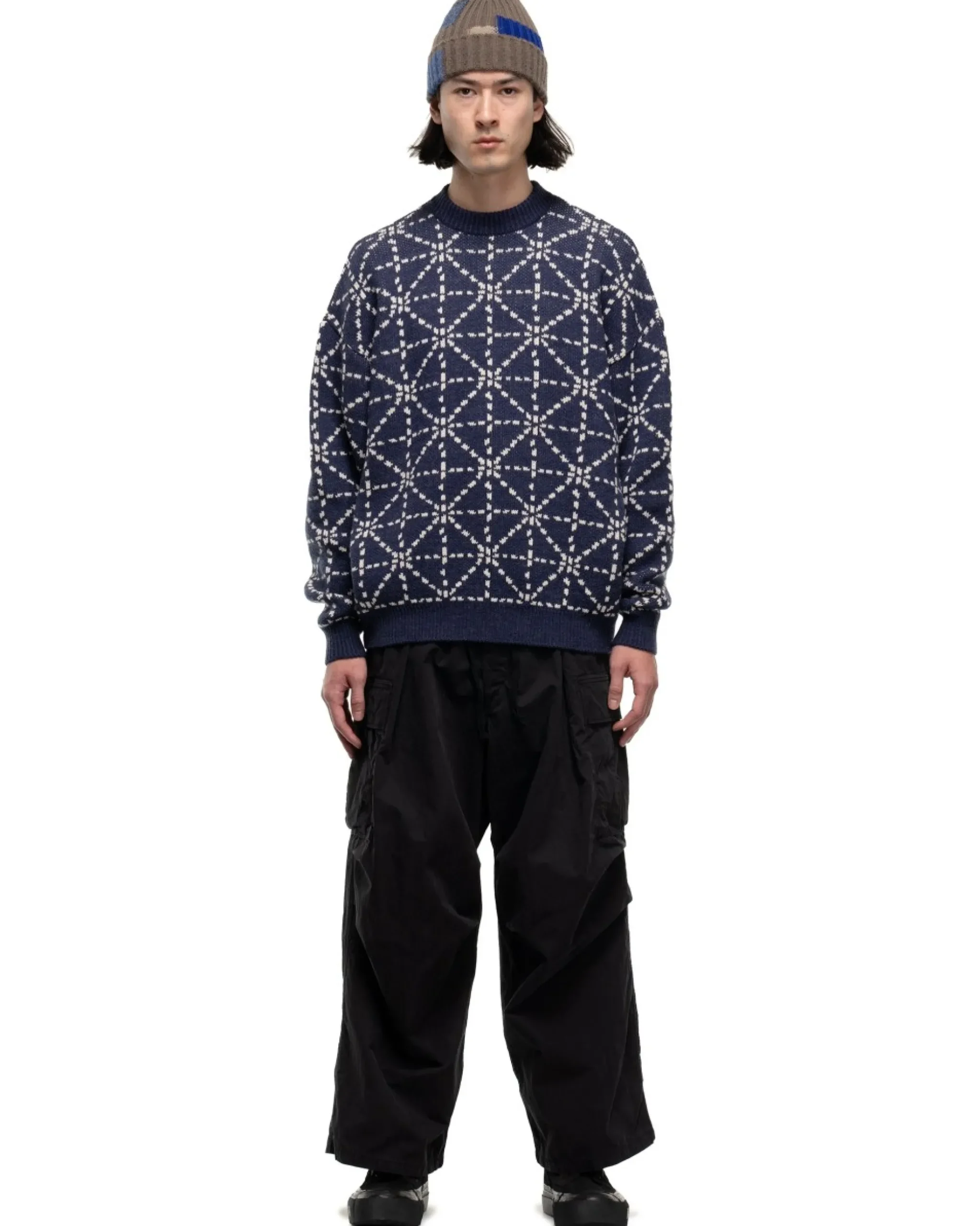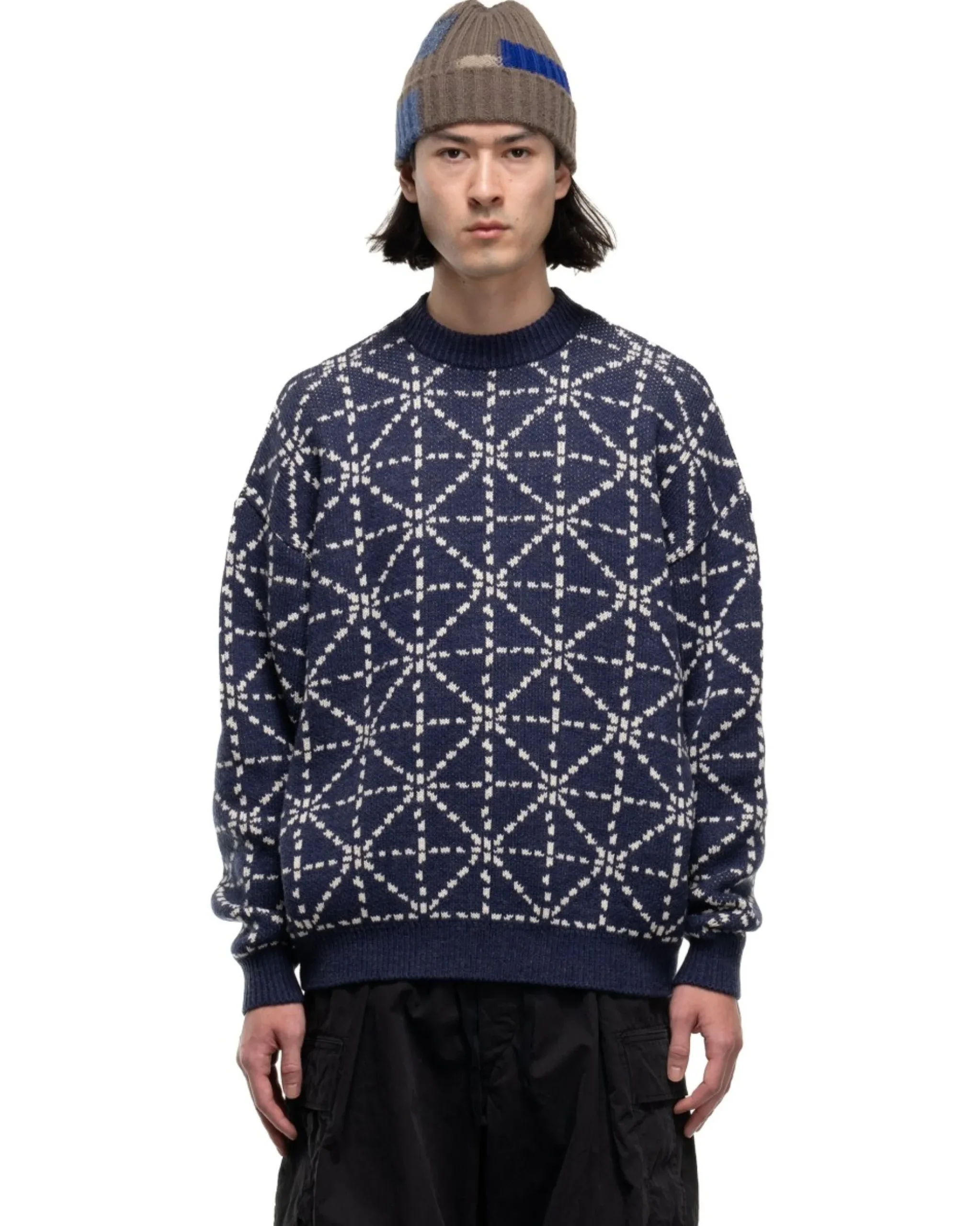 A 100% Wool Sweater In A 5 Gauge Knit With A Knitted Sashiko Motif Throughout. The Sweater Has A Boxy Fit With Ribbed Hem, Cuffs, And Neckline. Made In Japan.