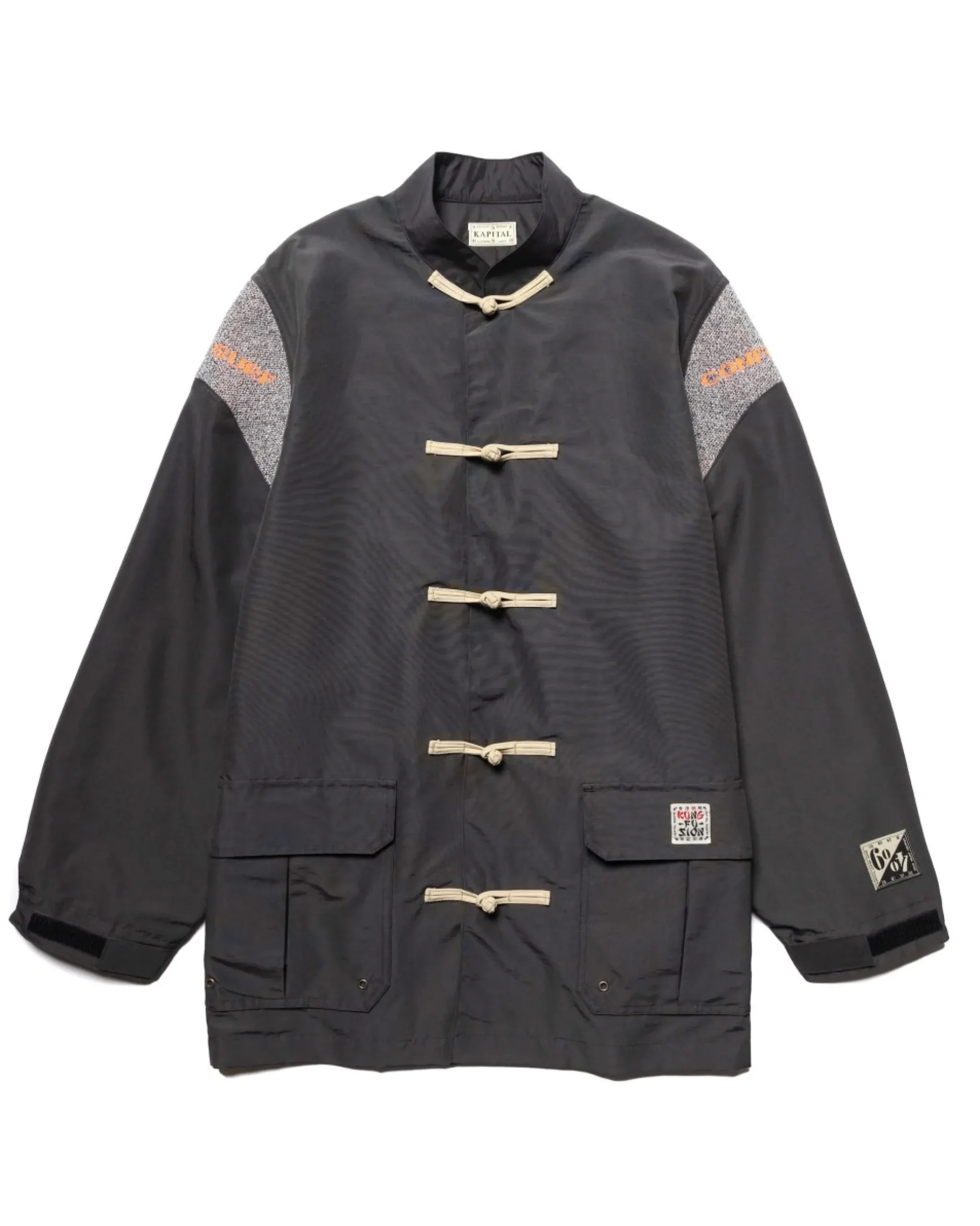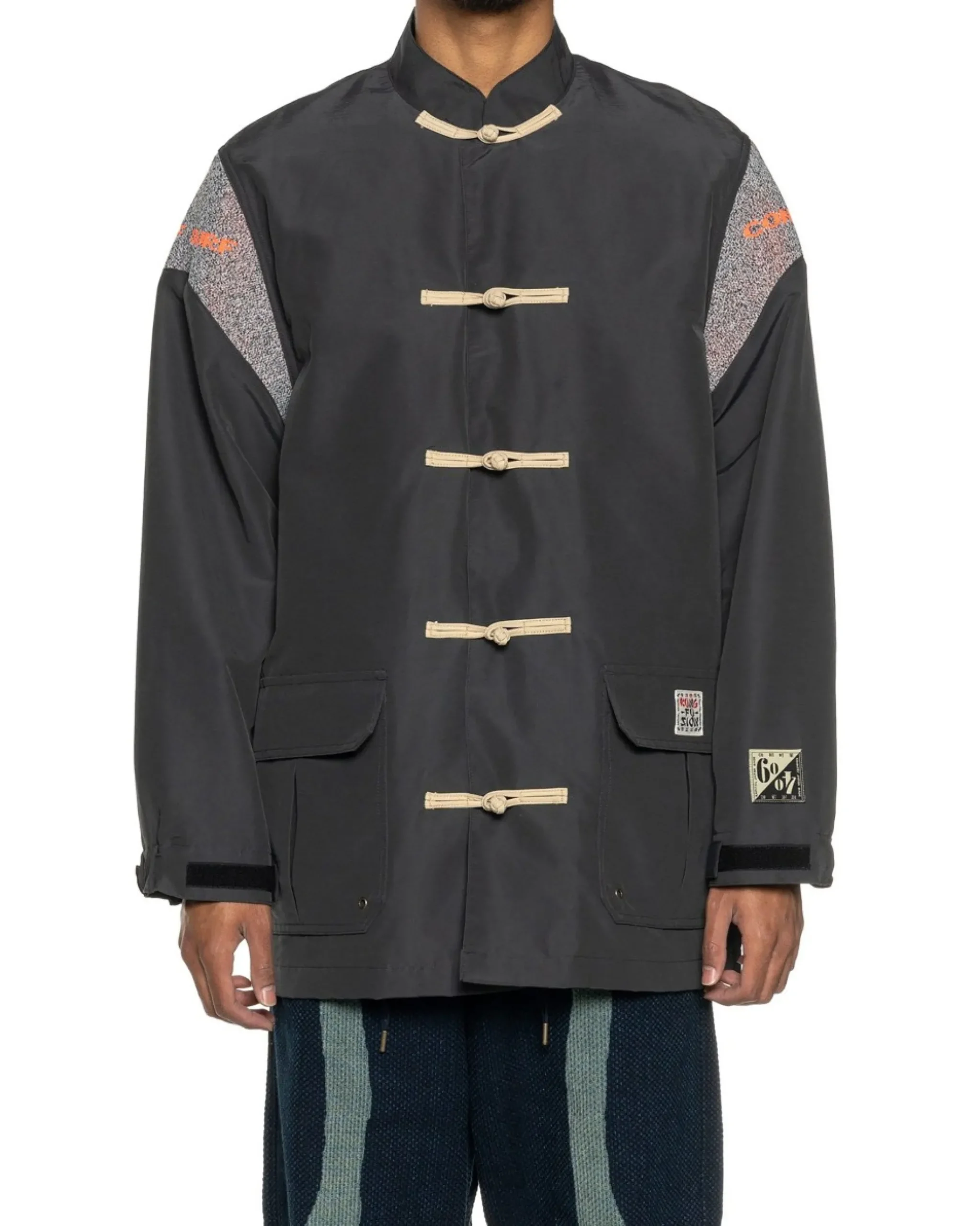 This Jacket Combines Classic Chinese Styling With The Practicality Of A Parka In A Cotton And Nylon Blend. Original Branded Ribbing Inserts At The Shoulders Offer Enhanced Range Of Movement, While The Placket Is Fastened With Traditional Chinese Frog Buttons. Two Gusseted Snap Flap Patch Hand Pockets Are Supplemented With Metal Ventilation Eyelets; Additional Storage Is Offered With An Internal Zip Stash Pocket. A Short Collar, Internal Drawstring Cinching, Semi-Elasticated Cuffs And Velcro® Tab Cuff Cinching Complete The Look. Made In Japan.