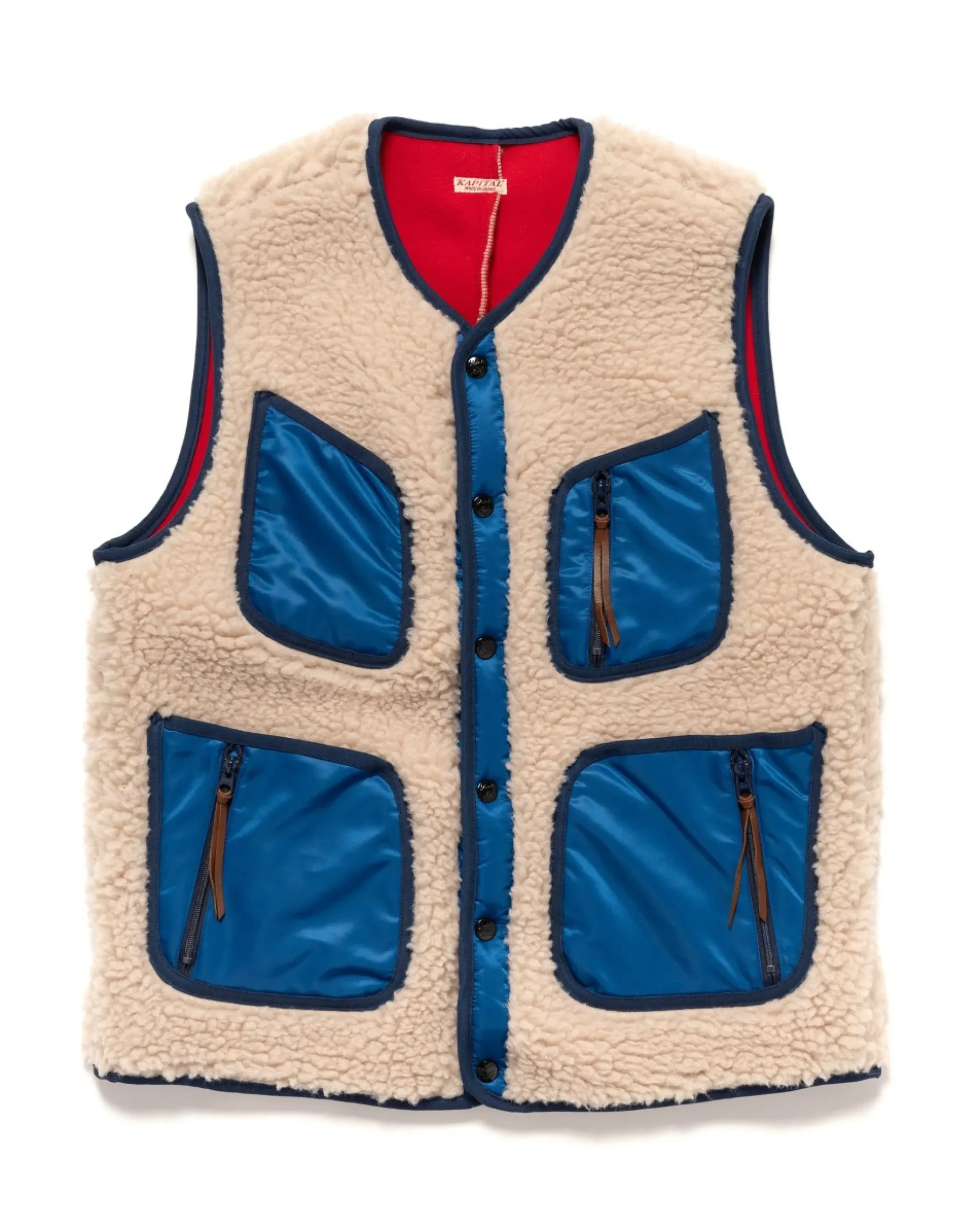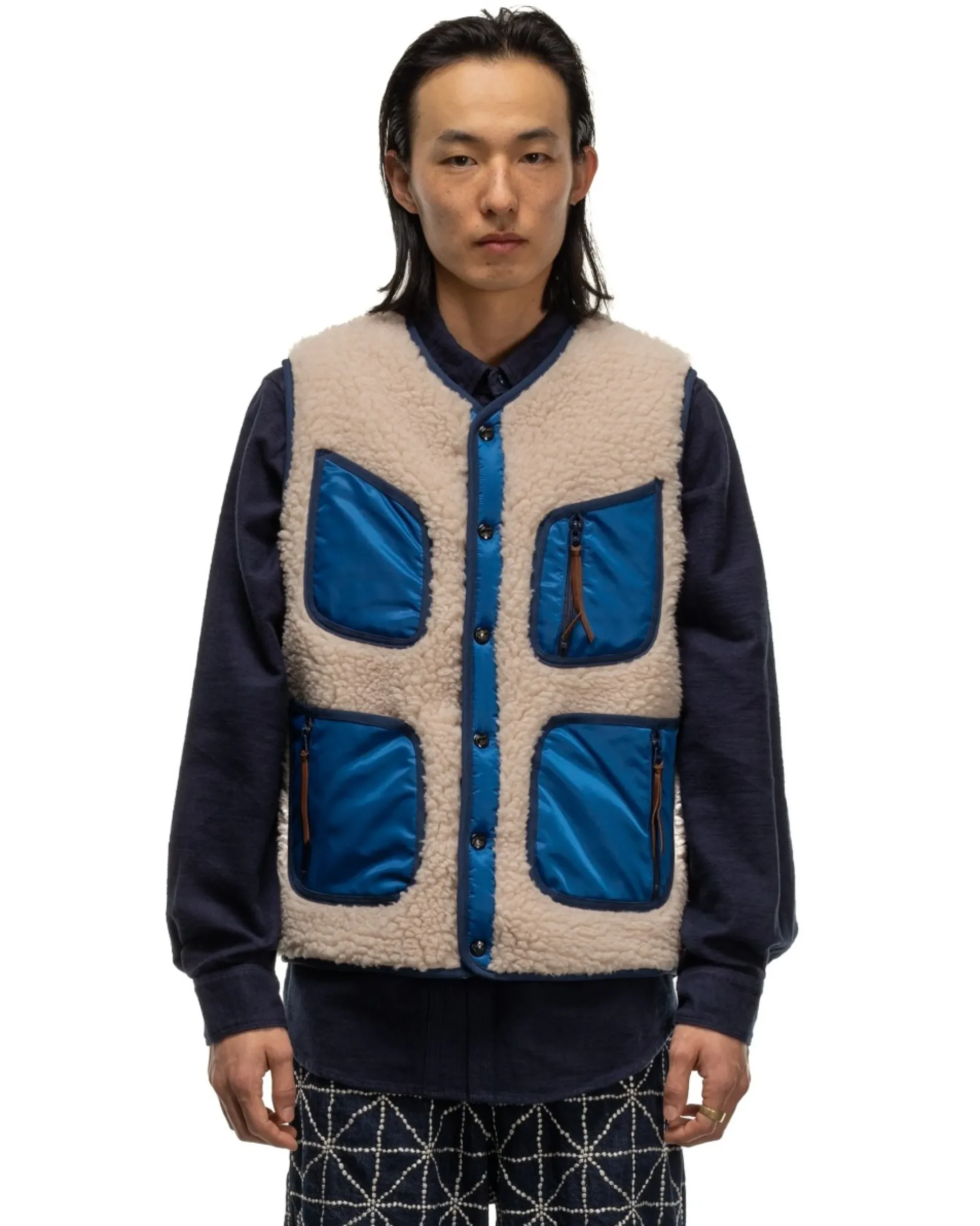 A High Pile Polyester Boa Fleece Vest With A Bonded Liner And Snap Button Front. Featuring Contrasting Nylon Hand Pockets With Zipper Pulls And Two Chest Pockets, One With A Zipper Pull. The Vest Has Snap Button Cinched At Each Side And Piping Around The Armholes, Hemline, And Collar. Made In Japan.