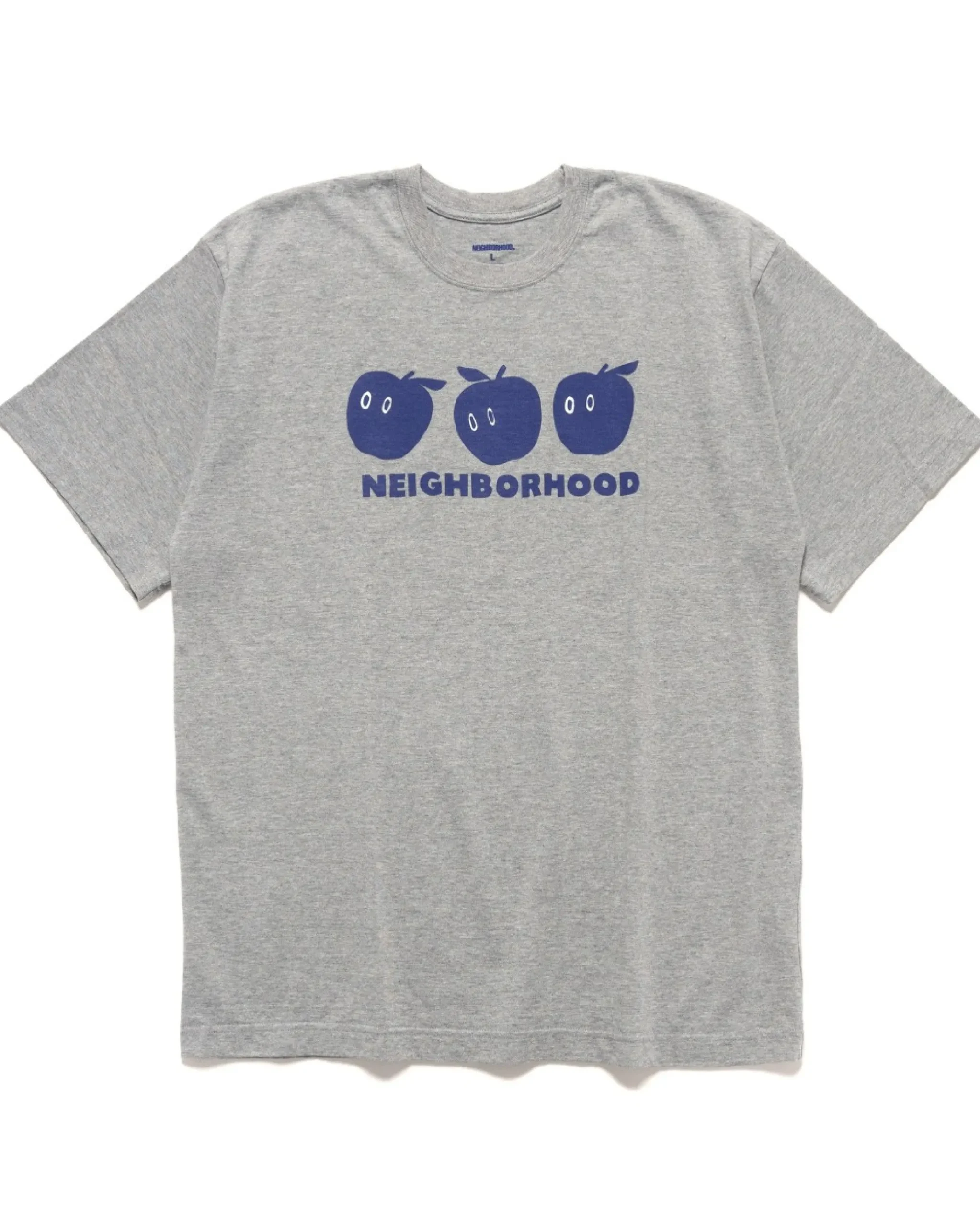 Soft And Relaxed Fitting Short Sleeve T-Shirt With A Seasonal Screenprint Graphic Featuring Playful Motifs Of Animated Apples With The Neighborhood Brand Logo. Made In Japan.